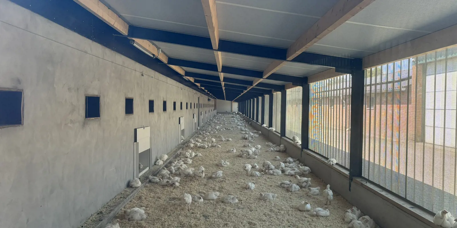 Koen: „Inzwischen haben wir einen überdachten Auslauf zwischen den Ställen gebaut und einen weiteren rechts neben einem Stall. Der Auslauf zwischen den Ställen hat an beiden Seiten eine ein Meter breite Öffnung, um ausreichend Tageslicht und Belüftung zu gewährleisten. Wir haben uns für ein Flachdach entschieden, da dies die praktischste und kostengünstigste Lösung war. Für das Erscheinungsbild des Betriebs haben wir die Vorderseite mit einem dekorativen Giebel versehen.“